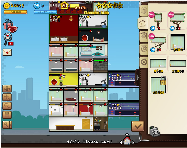 Данное меню предназначено для расширения площади вашего будущего отеля. Каждая комната занимает определенное количество блоков. И чтобы нам хватило на следующую постройку, необходимо предварительно позаботиться о покупке нескольких новых блоков.